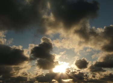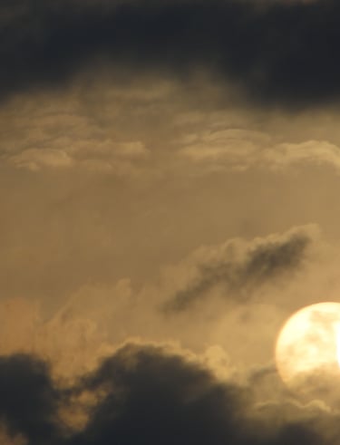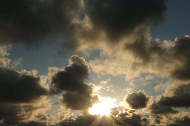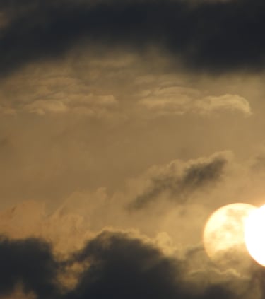Podwójne odbicie złotego słońca świecącego przez ciemne, dramatyczne chmury o zachodzie słońca.